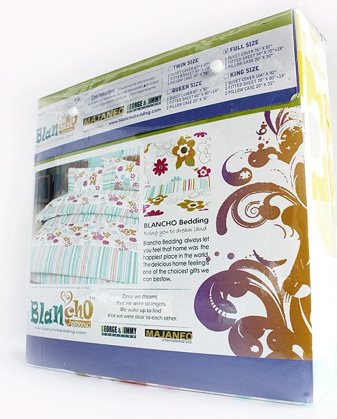 Six-piece set for Twin size (consisting of a pillowcase, a pillow sham, a fitted sheet, a flat sheet, a duvet cover & a comforter). Eight-piece set for Full, Queen and King Size (consisting of two pillowcases, two pillow shams, a fitted sheet, a flat sheet, a duvet cover & a comforter).Twin (Flat sheet : 66 x 96 inches; Fitted sheet : 39 x 75 inches; Duvet cover and Comforter : 67 x 87 inches; Pillow sham : 20 x 30 inches; Pillowcase : 20 x 30 inches); Full (Flat sheet : 81 x 96 inches; Fitted sheet : 54 x 75 inches ; Duvet cover and Comforter : 76 x 87 inches; Pillow sham : 20 x 30 inches; Pillowcase : 20 x 30 inches); Queen (Flat sheet : 92 x 102 inches; Fitted sheet : 60 x 80 inches; Duvet cover and Comforter : 87 x 90 inches; Pillow sham : 20 x 30 inches; Pillowcase : 20 x 30 inches); King (Flat sheet : 108 x 106 inches; Fitted sheet : 78 x 80 inches; Duvet cover and Comforter : 104 x 92 inches; Pillow sham : 20 x 32 inches; Pillowcase : 20 x 32 inches); Duvet covers are economical option to change the look and feel of your bed room without having to completely redecorate. Using duvet covers means not to invest a lot of money to do some changing in bedrooms. The concealed elastic band in the fitted sheet will firmly wrap the overall corners of the mattress, thus avoiding displacement. The design of extending the pocket size of the fitted sheet to 14 inches will fit with the most of mattresses. With a zipper on one end and twill ties at each inside corner of the duvet cover for you to tie to corresponding embroidered eyelet loop at corner of the comforter, so the comforter can be more securely tied to a duvet cover to keep it from shifting inside its cover while you sleep. Complete any bedroom decor with this stylish duvet cover set from Blancho Bedding. Includes 2 pillowcases, 2 pillow shams, 1 fitted sheet, 1 flat sheet, 1 duvet cover & 1 comforter.Full size comforter measures 76 by 87 inches with 45 oz hypo-allergenic breathable filling.This combo combines a duvet cover set, a sheet set and a luxury down-alternative comforter.Shrinkproof, anti-pilling and fading proof processes; 14 inches pocket size of the fitted sheet.Environment-friendly dyes; Fine and concentrated stitches; Machine washable and dryable.